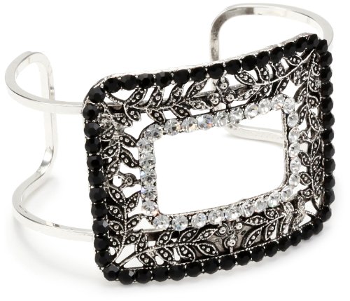 Yochi Clear and Jet Crystal Leaf on Silver Plated Open Square Cuff Bracelet by Yochi