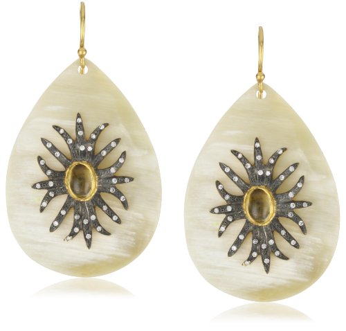 Citrine cabochon stone center surrounded by flush set cubic zirconia accents Made in India Teardrop shaped earring back is organic buffalo horn that has been sustainably & humanely harvested Art Deco inspired design with two-tone plating
