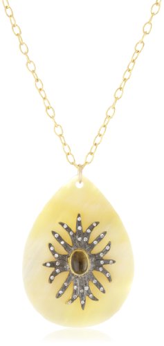 Teardrop shaped pendant back is organic buffalo horn that has been sustainably & humanely harvested Art Deco inspired design with two-tone plating Made in India Citrine cabochon stone center surrounded by flush set cubic zirconia accents