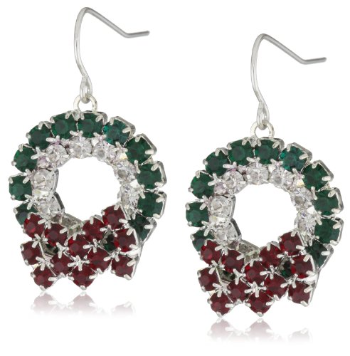 Red, Green, and Clear Crystal Faceted Glass Bead Holiday Wreath Silver Tone Earrings Feature